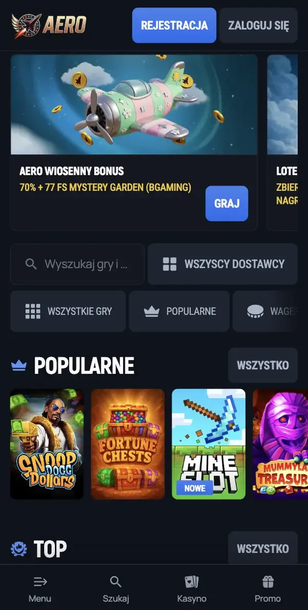 Promocje są również dostępne na telefonie. Standardowy pakiet powitalny może sięgać 400% do 17 200 PLN plus 200 darmowych spinów przy minimalnej wpłacie 90 PLN i wymaganiu obrotu 35x (wpłata + bonus) dla środków bonusowych, podczas gdy darmowe spiny mają obrót 40x. Prowadzimy też stałe oferty, takie jak nagrody Wheel of Fortune, wtorkowa promocja darmowych spinów oraz poniedziałkowy reload, więc Twoje opcje bonusu Aerobet są widoczne nawet podczas krótkich sesji mobilnych.